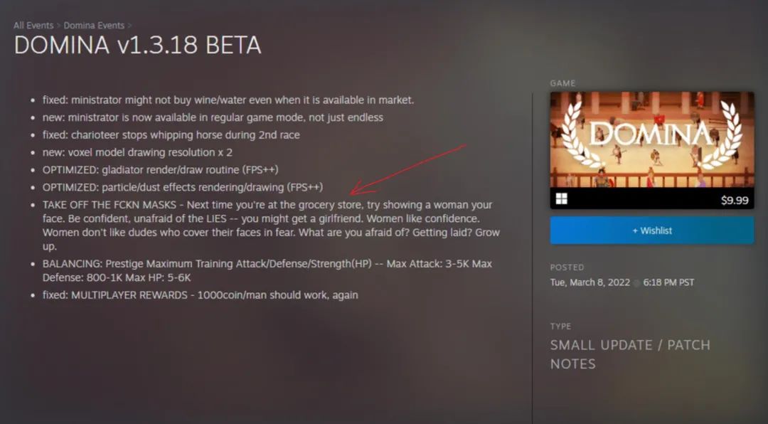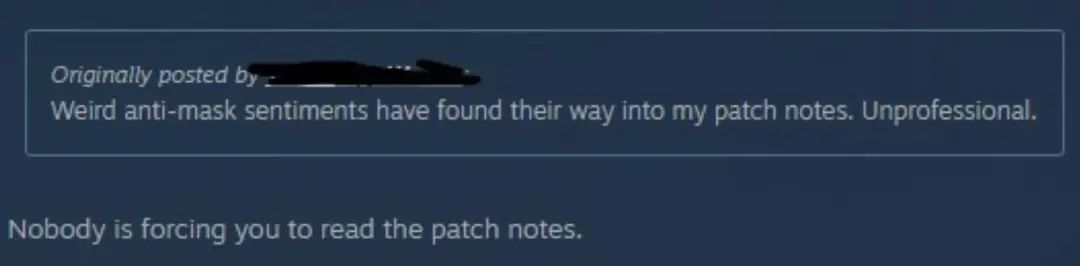 坦白說,這條信息與遊戲更新半毛錢關系都沒有,因此有玩家質問開發者,奇怪的反口罩聲明與遊戲補丁沒有關系,這太不專業了。開發者直接怒懟:「沒人逼著你看更新日誌。」