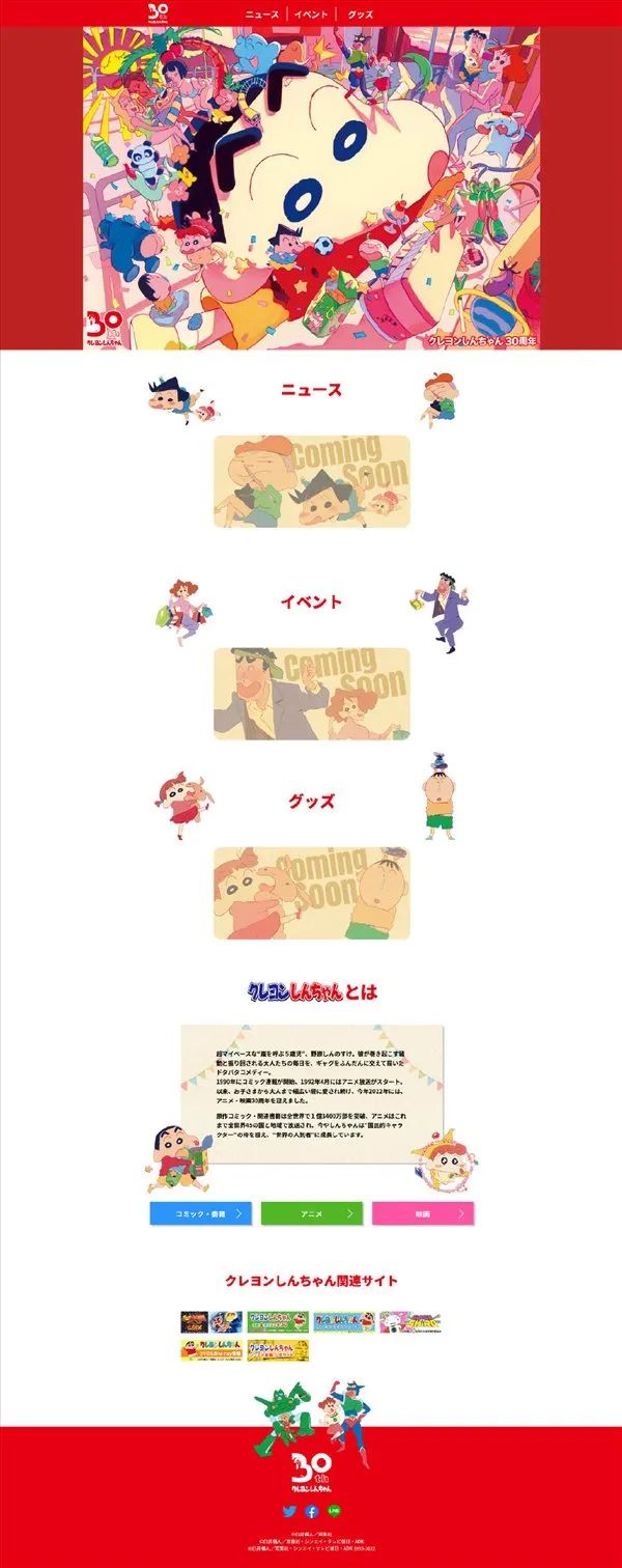 《蠟筆小新》是由臼井儀人創作的漫畫,1990年8月,在《weekly漫畫action》上開始連載,1992年4月13日動畫開播。明天迎來了動畫的30周年紀念日,官方分享了紀念賀圖,並且特設網址也同步上線,後續將公布相關紀念企劃與商品信息。
