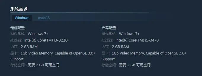 操作系統: Windows 7+處理器: Intel(R) Core(TM) i3-3220內存: 2 GB RAM顯卡: 1Gb Video Memory, Capable of OpenGL 3.0+ Support存儲空間: 需要 2 GB 可用空間