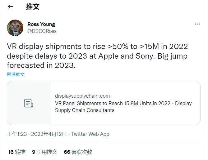 在宣傳該報道的推文中,Young說:「2022年VR頭顯出貨量即將超過1500萬台,漲幅超過50%,雖然索尼和蘋果的VR頭顯延期。」這或許暗示PSVR2原本計劃在今年晚些時候發售。