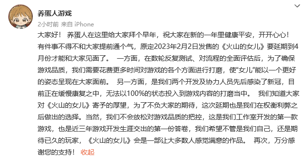 今日(12月30日),養蛋人工作室發文宣布原定2023年2月2日發售的美少女養成遊戲《火山的女兒》延期至4月份發售,官方解釋稱:「一方面,在數輪反覆測試、對流程的全面評估後,為了確保遊戲品質,我們需要花費更多時間對遊戲的各個方面進行打磨,使「女兒」能以一個更好的姿態呈現在大家面前。 另一方面,是我們兩個開發及協力人員先後感染了新冠,目前正在緩慢康復之中,無法以100%的狀態投入到遊戲內容的打磨當中。」