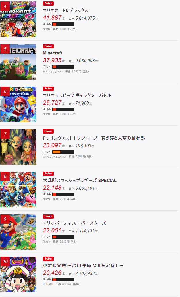 《斯普拉遁3》表現依舊亮眼,以12萬的銷量獲得亞軍,《NS運動》則以接近4.5萬的銷量重回前三。