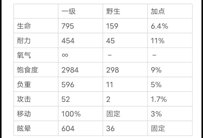 「一級」代表野生狀態下1級時的屬性,「野生」代表野生每級增加的值,「加點」代表馴服後每級增加的值。