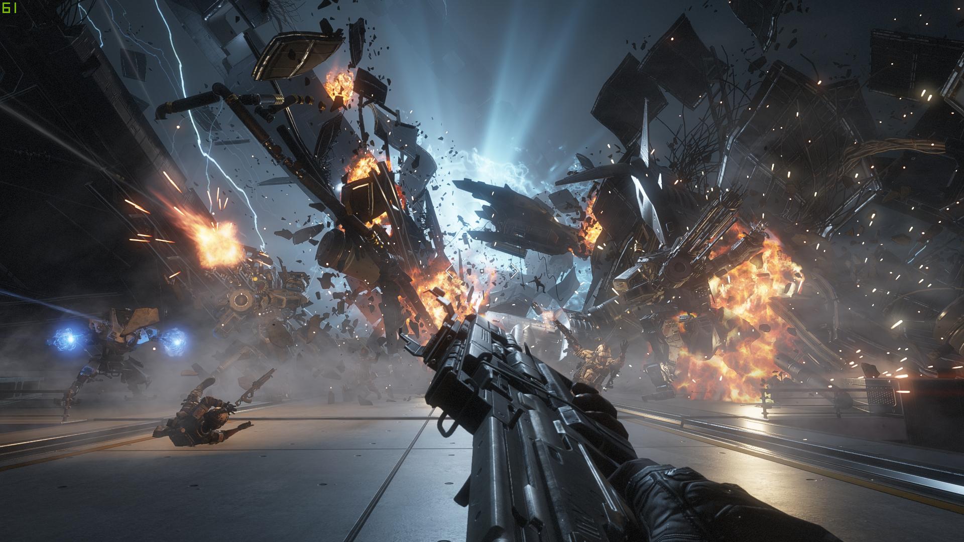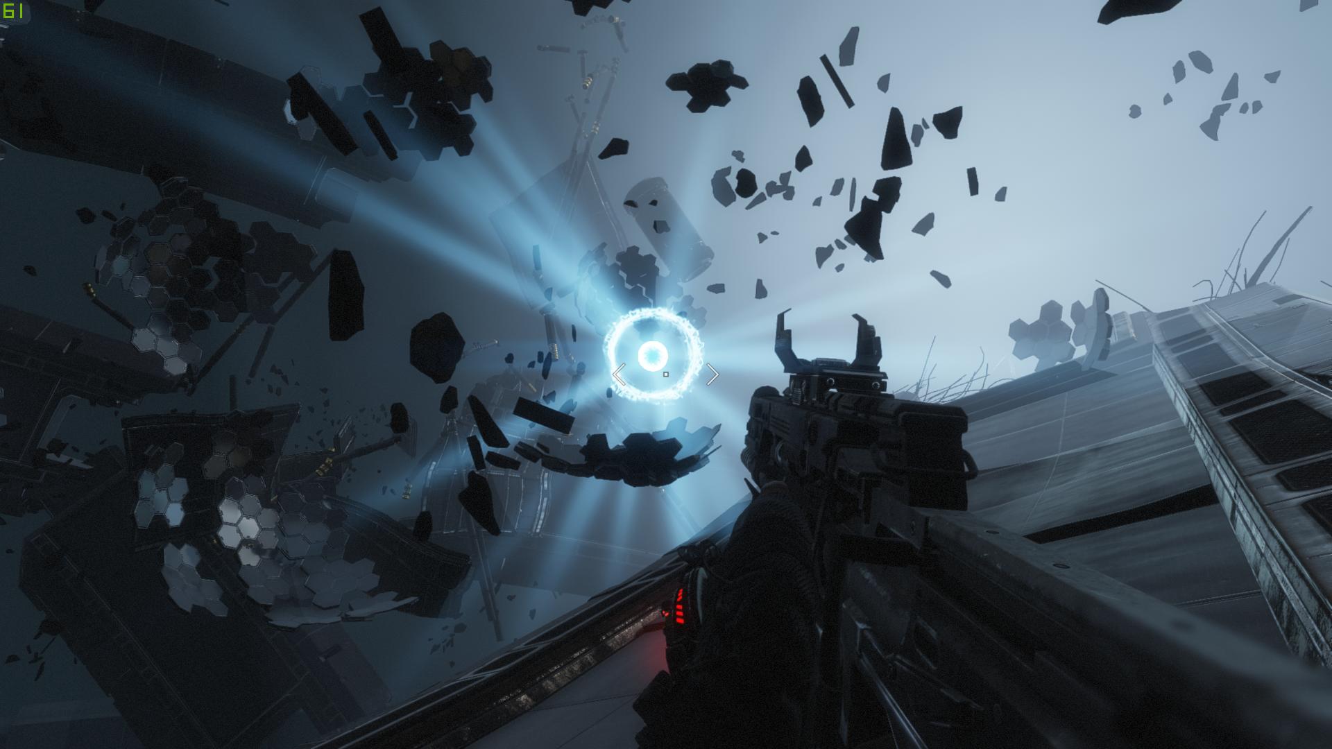 而且在這一關的最後有著堪比電影般的畫面,時間被砸瓦魯多,戰鬥時的爆炸與槍火,在空氣中緩緩凝固,漂浮著的火星猶如頭頂偌大的銀河在眼前熠熠生輝,破碎的建築與炸飛的礫石如宇宙里漂浮著的隕石,幽暗並危險。在空中穿過機甲的殘骸與一臉驚愕的敵人,眼前散發著藍光的球體,總有種莫名力量在吸引著我,我想這就是令人激動並震撼一點。