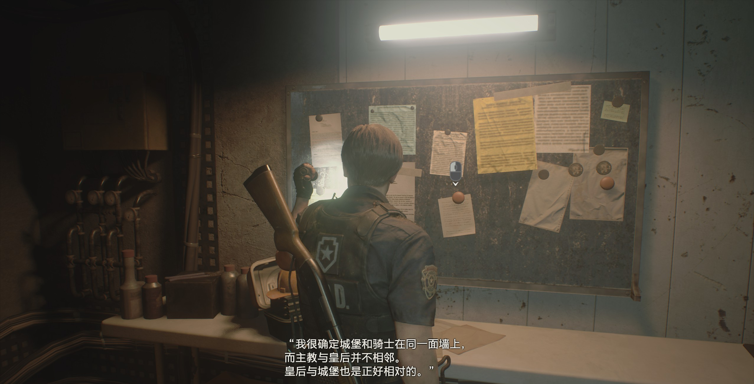 互動解謎作為生化系列的核心元素,無論是最新推出的生化3重製,還是本作都有體現,但後者中的解謎元素佔比就比較少。玩家遊玩本作時,需要控制角色在當前場景中不同的位置四處移動,搜集散落的文件與關鍵的線索道具,並依次返回到對應的解謎關卡完成解謎。總體流程還是很清晰的,解謎難度並不算高,只要仔細閱讀了文件上的提示都能輕鬆完成,實在不行也能夠查閱相關的謎題攻略,但游戲樂趣可能就下滑了一大截。