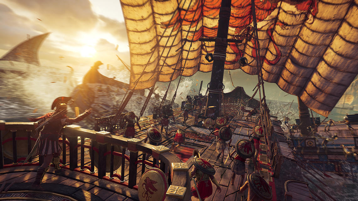 而海戰系統則基本是《黑旗》海戰的換皮重做。喜歡的人喜歡;不喜歡的人一言難盡,以至於選擇使用游過去把敵船船員屠戮殆盡再開船撞沉的邪道玩法。創新之處是副手系統,「副手「可以在你的船上作為裝飾、提供加成、在登船作戰時協助你,還可以在你平時作戰時被召喚出來分散敵人的注意力。本作海戰的最大亮點可能在於為廣大玩家科普了古希臘戰船的形制這一知識盲區;而最大不足則是海面的狹小,使人難以體會到《黑旗》中行駛在開闊海域上的波瀾壯闊之感。