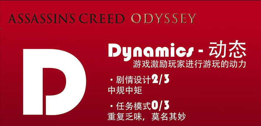 那麼結合全文不難看出,《刺客信條:奧德賽》擁有出色的機制M和美學A,卻給出了一個差勁的動態D:本作很好地結合了RPG和ACT,在戰斗和探索機制上都做到了相當優秀的程度;古希臘的自然和人文景觀的美好大家有目共睹;故事背後傳達的關於家庭、關於秩序與混亂的探討都值得思考;但重複性、機械性的任務設計讓單純的完成任務的過程變得枯燥無味,成為勸退不少玩家的原因。