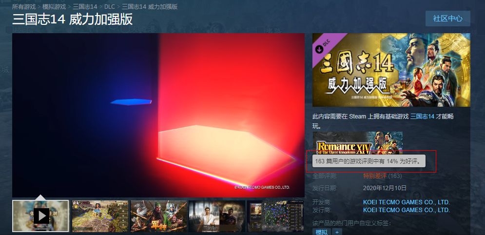 除了以上功能的擴展,《三國志14威力加強版》還增加了五個新劇本、三組歷史時間包和一些新個性、戰法等等。但是相比以往的威力加強版,《三國志14威力加強版》還是被不少粉絲冠上了「最弱威力加強版」的名號。要說冤那也不算冤,畢竟定價在那擺著,如此的分量也就和一個DLC不相上下,或者說這根本就是一個DLC。從游戲角度來講,《三國志14威力加強版》依然有著其系列獨特的魅力和相當的可玩性,但是從游戲定價以及光榮一系列的操作(製作人越後谷在採訪中曾表示想把14作為一款長期運營更新的游戲來做,時時吸取玩家意見來改進,但是也隱晦的表示自己所處的地位並不支持他來做出這一決定。),這實在是一個失敗的商業作品。失敗的地方很多,就我看到的而言,最失敗的莫過於steam游戲評價,要知道小眾可能算不上,但是一定是粉絲向的作品,會花如此高昂的代價第一時間買《三國志14威力加強版》的大部分真的只能是系列遺老粉。