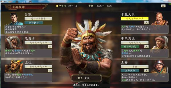 乍一看之下跟跟異族開展外交或者征服異族有著不錯的好處,但是首先異族開展外交就涉及到前面提到的地利系統,需要佔據對應異族的地利效果才可以與異族開展外交,獲取地利效果這一前提暫且不論。就征服異族這一點來說,其難度和收益完全不在一個量級,30萬兵力、9999耐久據點以及每回合超強的恢復能力,說實話如果玩家可以攻下一個據點不知道能攻城拔寨多少城池,真有這實力的話哪裡還用得上這些異族將領和每年那點兵力。就算僅僅是外交,其帶來的收益也相當有限,外交中想要讓異族出兵攻打敵對勢力的代價動輒數萬金,有些玩家可能到通關都不一定能見到這麼多金,也只有一些小勢力前期過度破局時可能用得上一些異族將領。而且在14這套系統中內政人才異常重要,異族將領只能帶兵打仗不能參與內政也很尷尬,很多時候更像是聊勝於無,我們就當他不存在,不要去招惹他也未必要去拉攏他。