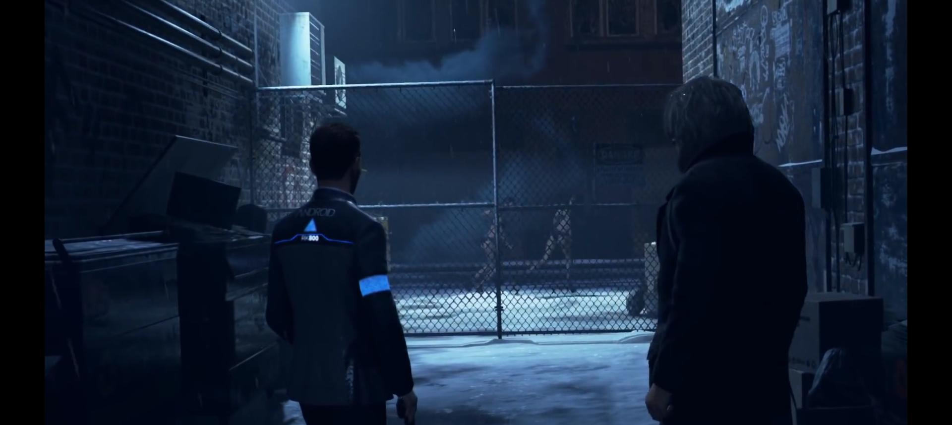 目前為止天氣都只是敘事的一部分,且並不太引人注目。直到雪的出現,讓天氣從幕後走向了台前。遊戲里第一次出現雪是在康納和漢克副警長前往仿生人夜總會辦案的時候。而當他們走出夜總會的時候積雪已經覆蓋了小巷的地面。這時候的康納也在和兩位女性仿生人的戰斗中處於一個關鍵的抉擇中,開槍還是不開槍。劇情也隨著雪花的出現進入了快車道,三位主角之間的影響變得越來越強,底特律的氣氛也變得越來越緊張。