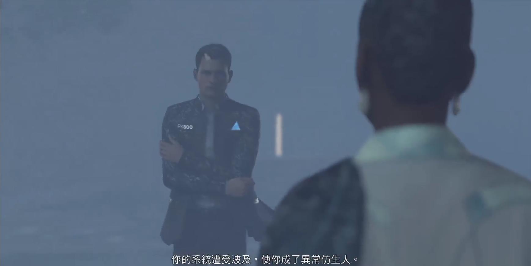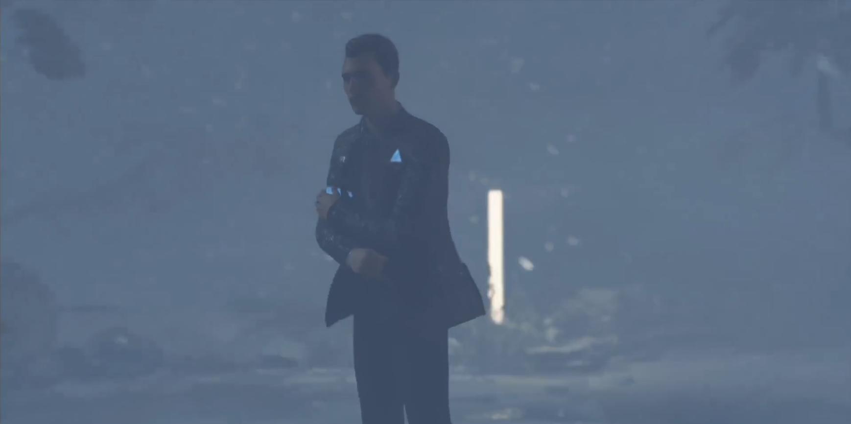 當康納最終帶領著數千仿生人倆到了馬庫斯面前,他被黑了。他的意識已經來到了那個熟悉的庭院里,他曾經在這個虛擬的世界裡這里向自己的創造者匯報進展。不過那時候精心保養的庭院現在完全被大雪遮蔽。康納彷彿就在濃霧中艱難潛行。雪成為了他身為仿生人一面和人的一面沖突的具象化。