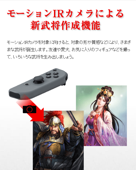 游戲還可以通過Nintendo Switch 搭載的動感 IR 照相機功能來製作全新的武將。只需要下壓joy-con的右搖桿,在開始IR相機功能後,將其對準人物即可。