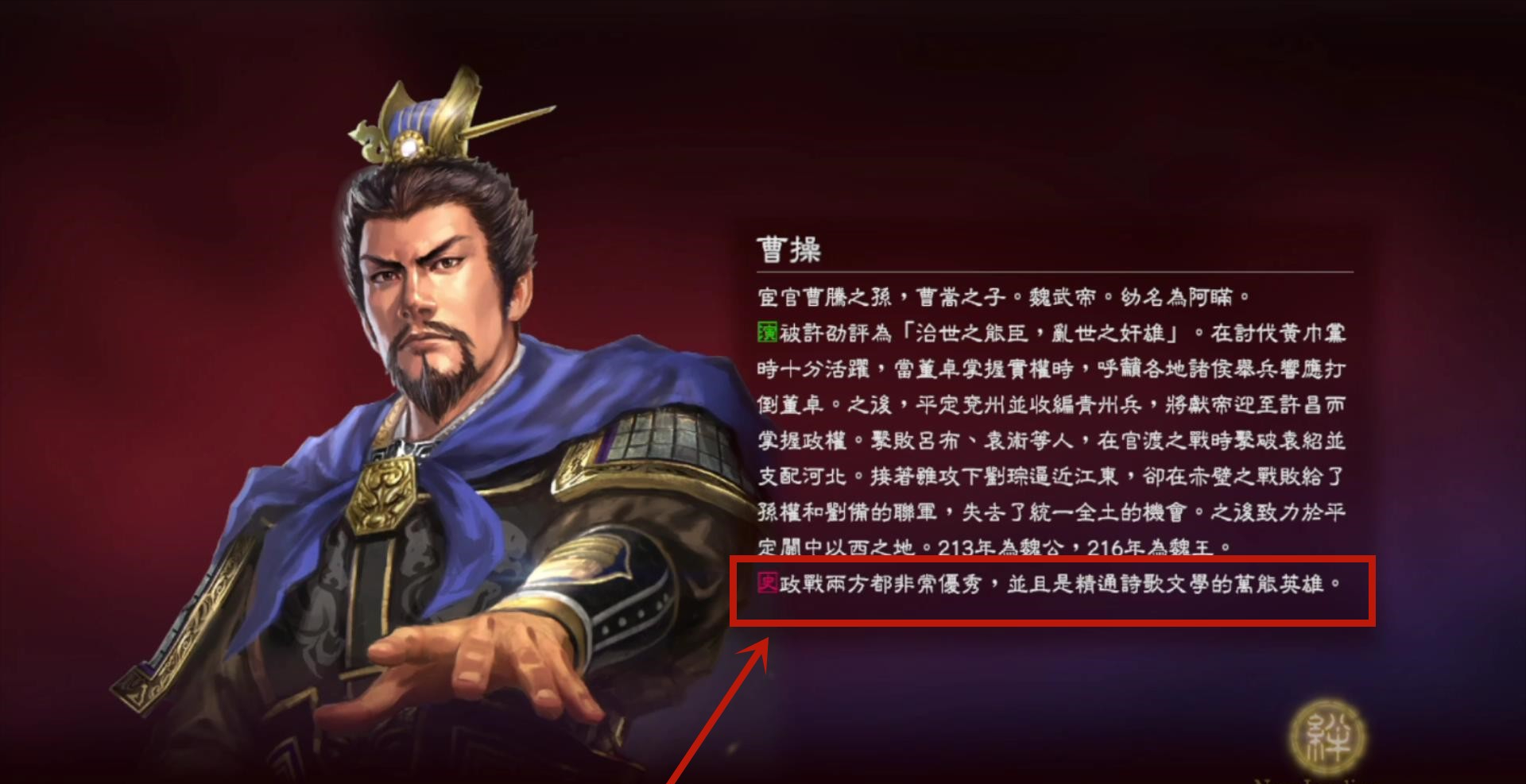游戲中對於曹操的評價也特別指出了精通文學和詩詞歌賦