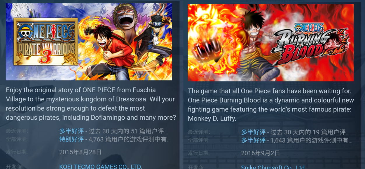 作為還在連載三大民工漫,《海賊王》無論是動畫還是漫畫,熱度不遜色於當下一些季度霸權番,且改編遊戲也同樣擁有不錯的評價。到目前為止以《海賊王》改編的各類型遊戲發售在各個平台上,比如在2015年3月發售於PC、PSV、PS3、PS4平台的無雙割草遊戲《海賊無雙3》與PC、PS4、Xbox平台的格鬥遊戲《海賊王:燃燒之血》,兩者在商店頁面中分別擁有特別好評與多半好評的用戶評價。