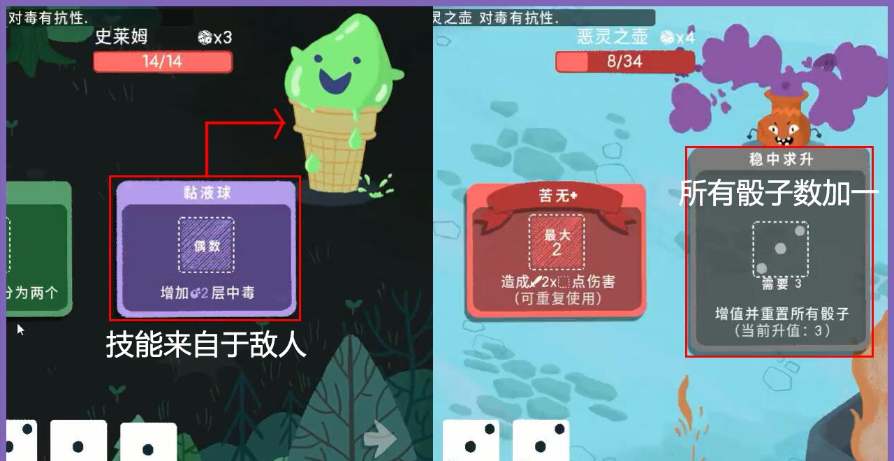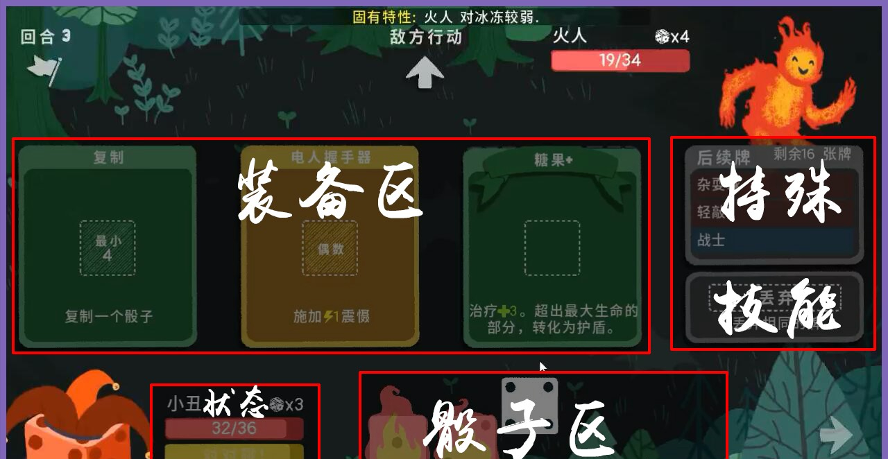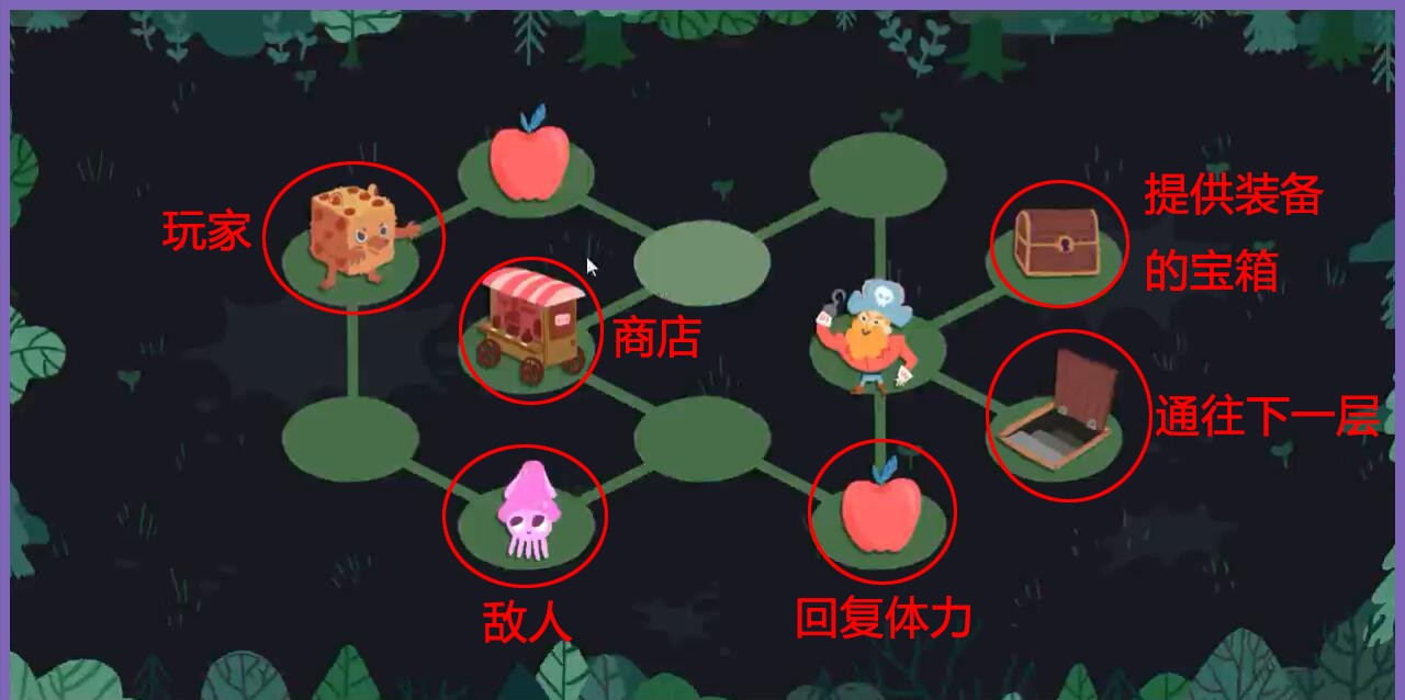 紅色小車:商店,可以購買裝備;蘋果:大部分的蘋果都是回復生命值,但是偶爾會有「爛蘋果」摻雜在其中,過去了會進入戰斗,如果此時您的生命值很低,那就吃了大虧了。好在其實在我們用游標指到蘋果上時是可以看見其效果的,還請各位新手玩家們小心。寶箱:提供裝備;綠色小車:隨機換取裝備;鐵砧:用於升級裝備。圖紙:用於復制裝備2.戰斗界面