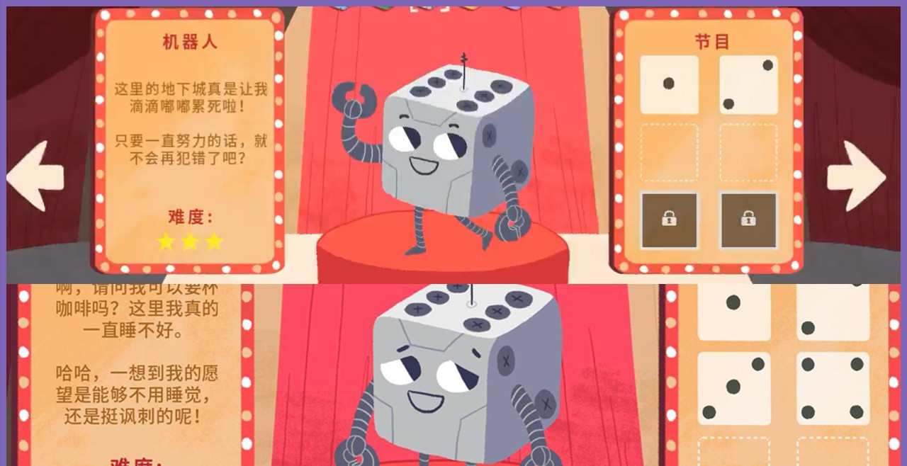 無論是哪個角色,只要參加了遊戲中的綜藝節目都會變成骰子。在遊戲剛開始的時候,每個骰子都是面帶微笑的;然而隨著節目越打越多,骰子們的臉上雖然仍然保持著笑容,但明顯透露著巨大的疲憊。它們眼部表情與肢體動作上的變化與嘴上一成不變的笑容所形成的巨大反差,為遊戲營造了一個既怪異又令人不適的詭異氛圍(如圖2-1)。