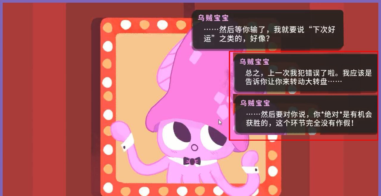 最諷刺的是,在玩家解開小丑角色之後,幸運女神會抓來烏賊寶寶來主持轉盤的環節。烏賊寶寶本性單純而口直心快,所以每次都實話實說,具體內容如下:
