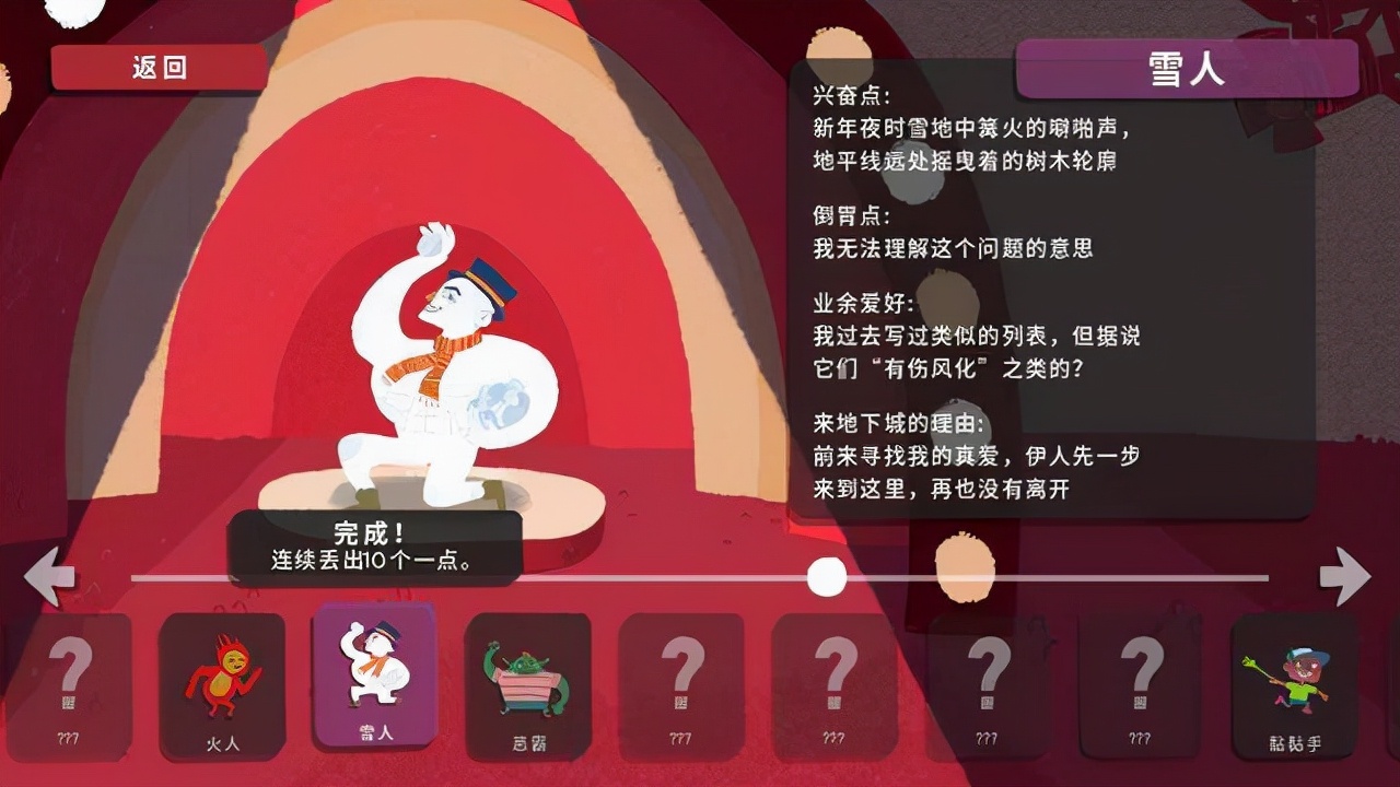這些挑戰關卡對比同類遊戲的困難模式,缺少硬核玩家追求的高難度,增加了遊戲玩法的多樣性,但是本作缺乏吸引玩家的成長收集機制,以《殺戮尖塔》舉例,玩家在多次遊玩後可以提升職業等級解鎖更多卡牌,但玩家在本作中完成更多挑戰賽的獎勵只是某種「怪物圖鑒」。該圖鑒記載著地下城敵人信息的圖文資料,對玩家遊玩沒有任何改變,大概只有收集癖的玩家可以為了全成就多次重玩。