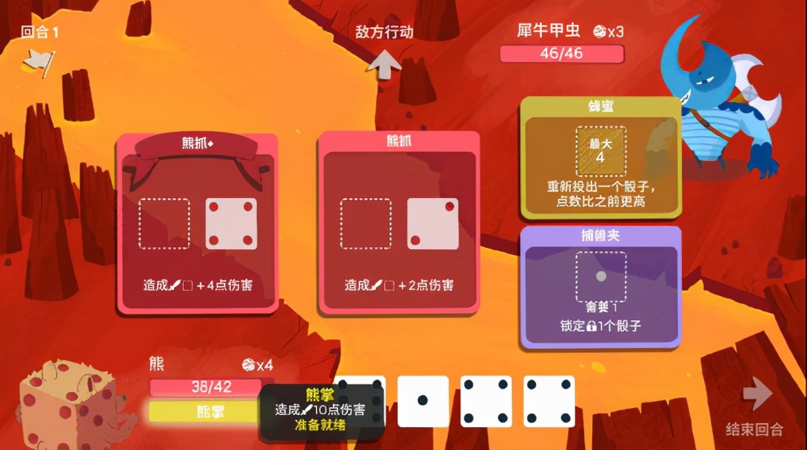 親民的上手難度《骰子地下城》的攻擊模式全部由骰子來決定,操作簡單,非常容易上手。這款遊戲的核心機制在於骰子,具體來說可以分為兩個部分,如何獲得骰子和如何使用骰子:玩家升級可以增加骰子,每回合獲取若干骰子,骰子數字在1~6隨機生成,作用類似於卡牌遊戲資源中的「法力值」,沒有骰子玩家就無法使用裝備,但骰子數值並非越大越好,而是需符合裝備要求使用。
