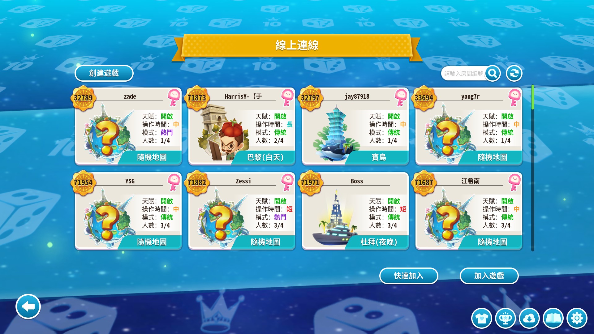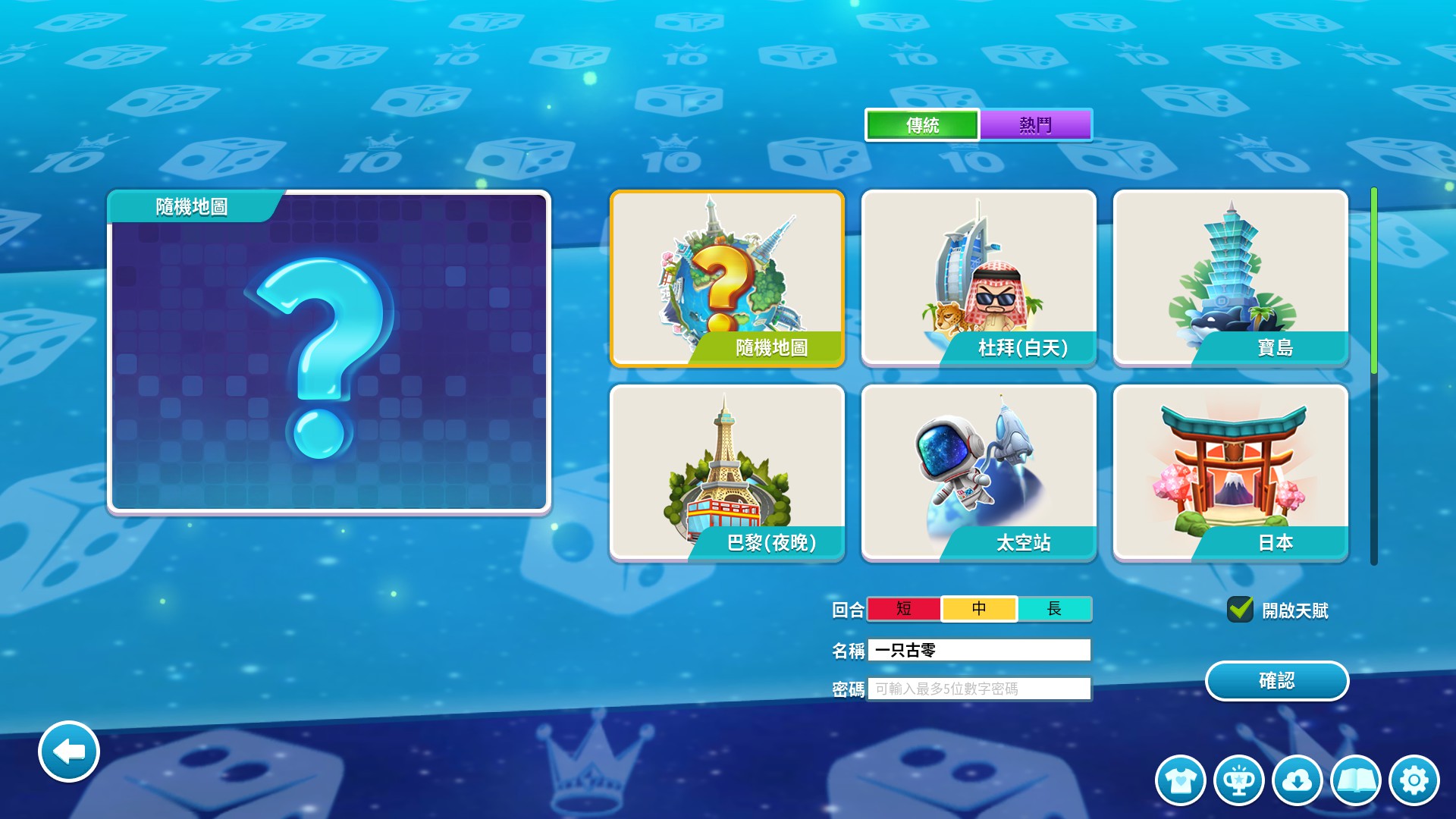 首先來介紹一下游戲的整體情況。《大富翁10》目前一共擁有八個地圖,分別為非洲、迪拜、巴黎、上海、東京、台灣、南極、太空。主要人物目前有6位,除了經典角色孫小美、錢夫人、沙隆巴斯以外,還有高人氣角色阿土伯、金貝貝和忍太郎。游戲模式主要分為本地模式和線上模式,也就是我們通常所說的單機與聯機。本地模式又分為單人游戲(故事模式/傳記模式),多人游戲(傳統模式/熱斗模式);線上模式分為傳統和熱斗模式。
