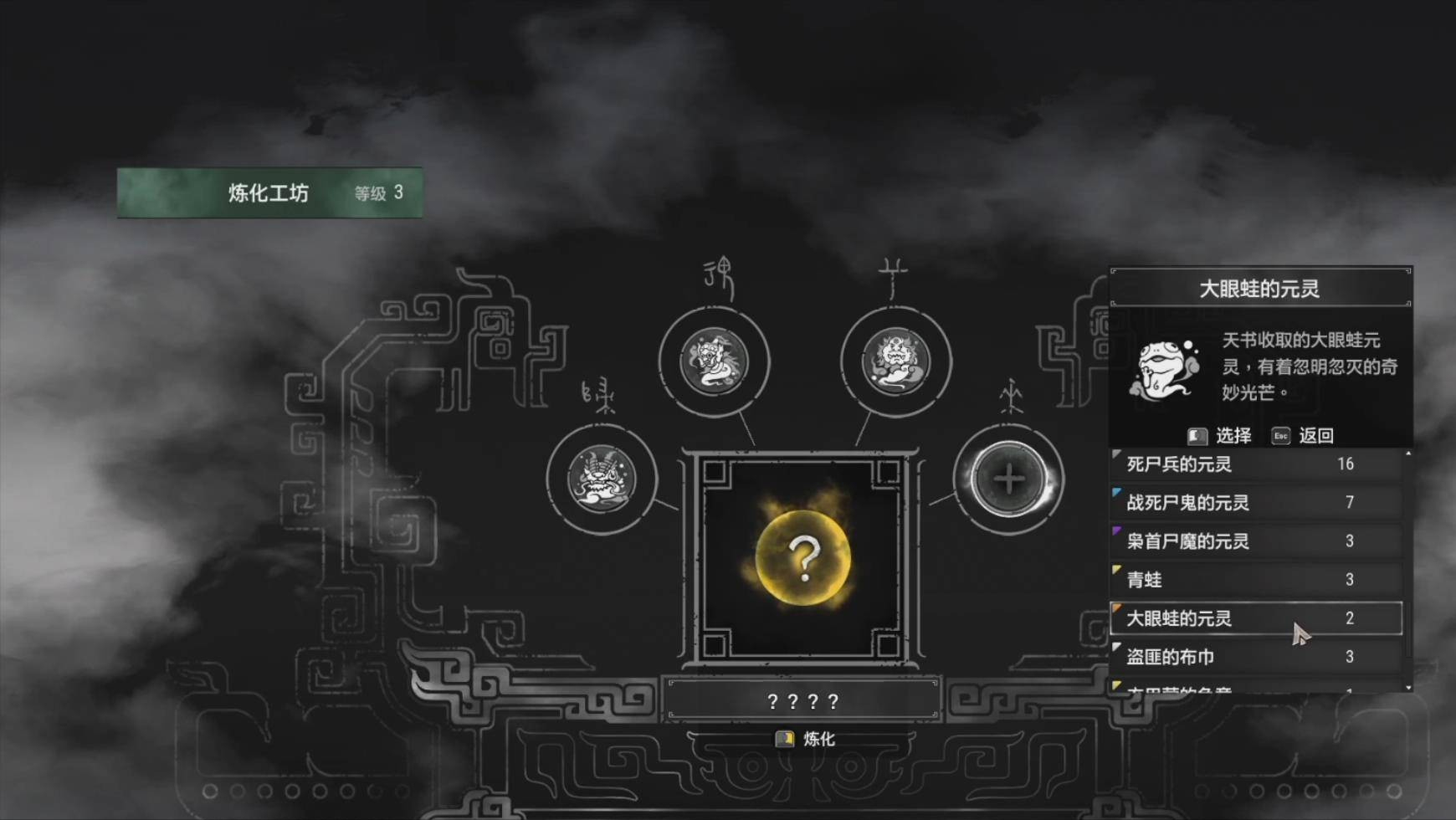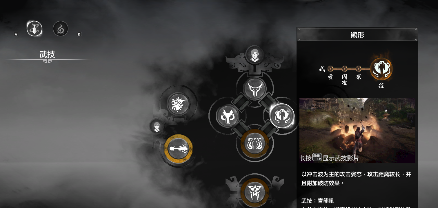本作中的技能共計分為5大類型,除了最基礎的「狼」、「虎」、「熊」、「牛」四種以外,在打敗Boss「檮杌」後還會獲得另外一種形態。不過,想要使用這些技能都有著一個共同點,那就是——玩家必須提升技能熟練度。玩家需要裝備該形態並在戰鬥中使用,系統會依據玩家在戰鬥中使用次數,在結束後換算為相應技能的熟練度。
