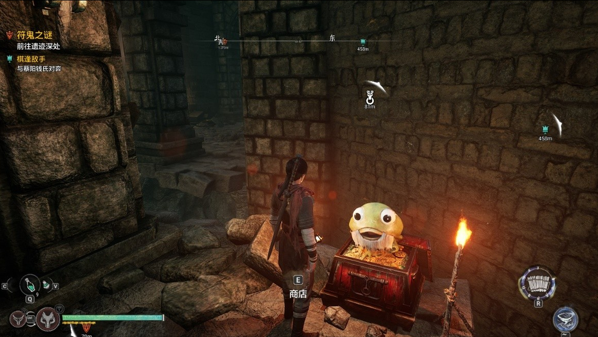 然後就是劇情和地圖上的一些解密元素了,但是都很簡單,無非就是路上藏起來的寶箱(可有可無)和小道里的隱藏商店,聽到有奇怪的呻吟估計就在附近。劇情上的解密我更認為是種小遊戲而已,很簡單的(不會吧不會吧不會有人解不出來吧),耐心點都能過。