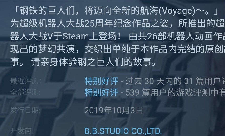 《超級機器人大戰V》為萬代南夢宮在2017年2月於PSV與PS4平台發售的超級機器人大戰系列遊戲作品,去年10月移植到NS與PC端發售。由於個人並不是機戰系列的老玩家,V是我遊玩的第一部機戰系列作品,無法作出很詳細對比還請老玩家見諒。