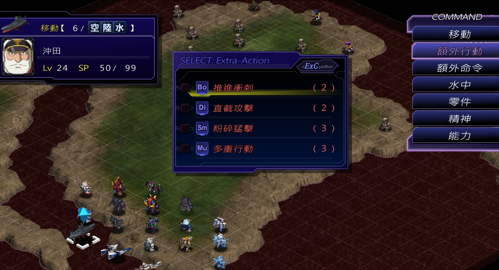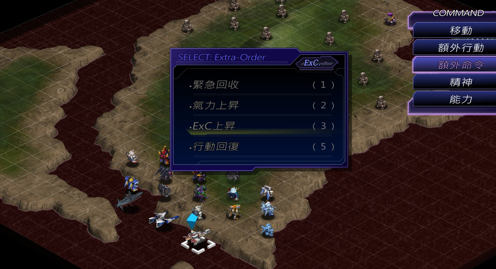 高達機體與戰艦都可下達主動攻擊指令、額外行動指令、精神三項指令,戰艦可額外下達額外命令,兩種額外指令都需消耗規定的ExC點數,ExC點數通過擊敗敵人獲取。與G世代火線縱橫最多可執行三次攻擊指令不同的是,如沒發動額外行動中的多重行動指令,所有機體都只能發動一次攻擊,發動多重行動指令後則可在擊敗敵人後再次發起攻擊指令,前提是有充足的ExC點數供予消耗。