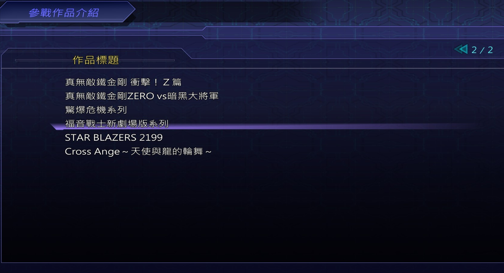 登陸本作的高達作品共有無敵超人桑波特3、無敵鋼人泰坦3、機動戰士Z高達、機動戰士高達ZZ、機動戰士高達 逆襲的夏亞、機動戰士高 達閃光的哈薩維、機動戰士海盜高達系列(骷髏之心 鋼鐵的七人)、機動戰士高達Seed Destiny、劇場版機動戰士高達00 -先驅者的覺醒、機動戰士高達UC、勇者特急隊、劇場版機動戰艦撫子 -黑暗王子-、真蓋特 世界最後之日、真魔神 沖擊!Z篇、真魔神ZERO vs暗黑大將軍、全金屬狂潮系列(Fumoffu TSR 原作小說版)、新世紀福音戰士新劇場版系列(序 破 Q)、宇宙戰艦大和號2199、Cross Ange 天使與龍的輪舞26部,其中閃光的哈薩維、骷髏之心與鋼鐵七人、勇者特急隊、真魔神ZERO vs暗黑大將軍、宇宙戰艦大和號2199、Cross Ange 天使與龍的輪舞為首次參戰超級機器人戰鬥系列的高達作品。
