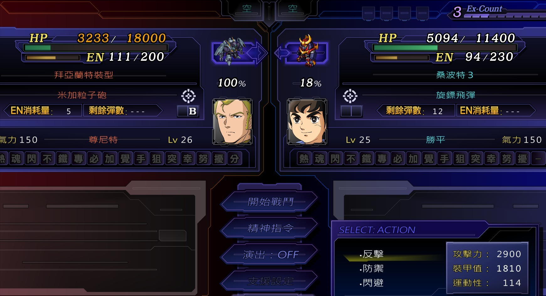 選取好攻擊招式後便進入與敵人各項詳細數據對比展示欄,通過觀察攻擊的成功率以便確定是否對選中敵人正式攻擊。如成功率相差甚遠,可對機體下達精神指令「必中」,可將攻擊成功率提升至100%並必定對敵人造成傷害。本作提供了16項精神指令,角色使用精神指令會消耗SP值,如果低於精神指令的規定SP值則無法使用,此時玩家可以選取場上其餘角色對SP不足的角色下達指令,靈活使用精神指令可提高戰鬥成功率。