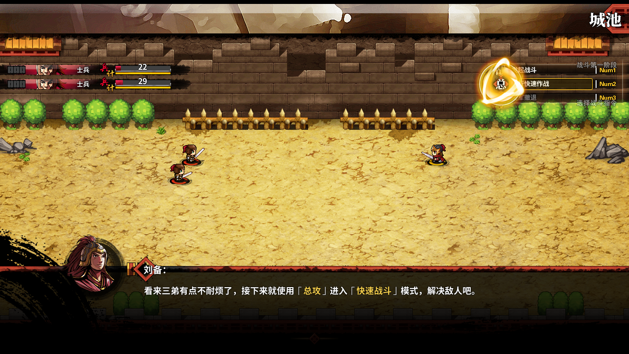 目前來看戰鬥難度適中,游戲中有一個兵力值大小影響最終造成傷害的設定,使得戰鬥更具有策略性。在不同的血量使用普通攻擊、策略還是武將技對戰鬥有著至關重要的影響,一些傷害不受兵力影響的技能可以在殘局中起到扭轉戰局的作用。而游戲最大的難度還是在於連續的無補給戰鬥,在第一boss戰中遭遇張角,需要連續挑戰普通張角和變身的張角,使得原本平滑的難度曲線陡增,當然這種緊張刺激的boss戰也是戰鬥系統魅力所在,在這樣的戰鬥中除非把等級肝的很高,否則不藉助藥品是很難順利通過的。
