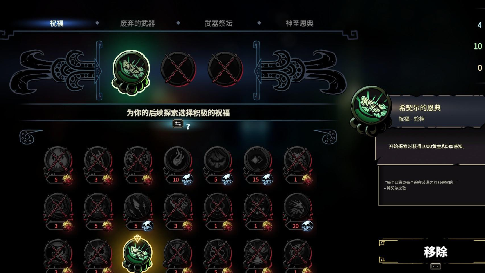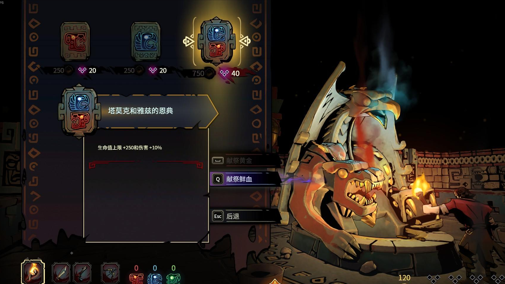 腐化值如果只能通過進入房間獲取那麼真的沒什麼可講的,實際上獻祭才是腐化的關鍵使用機制,獻祭在遊戲中是升級武器、獲取能力等提升人物角色傷害的重要渠道。獻祭(也可使用黃金進行獻祭)會增加人物的腐化程度,但會極大的提升玩家角色的能力,腐化像是遊戲提供給玩家的一種預支,這種預支基本上是「無代價的」,而這種「無代價的」快樂還真是不錯,可惜過度的預支會帶來後期人物陷入致死詛咒中,導致整個遊戲陷入僵局,玩家在腐化帶來的詛咒和獻祭帶來的能力之間如何做平衡是一個不錯的遊玩樂趣。
