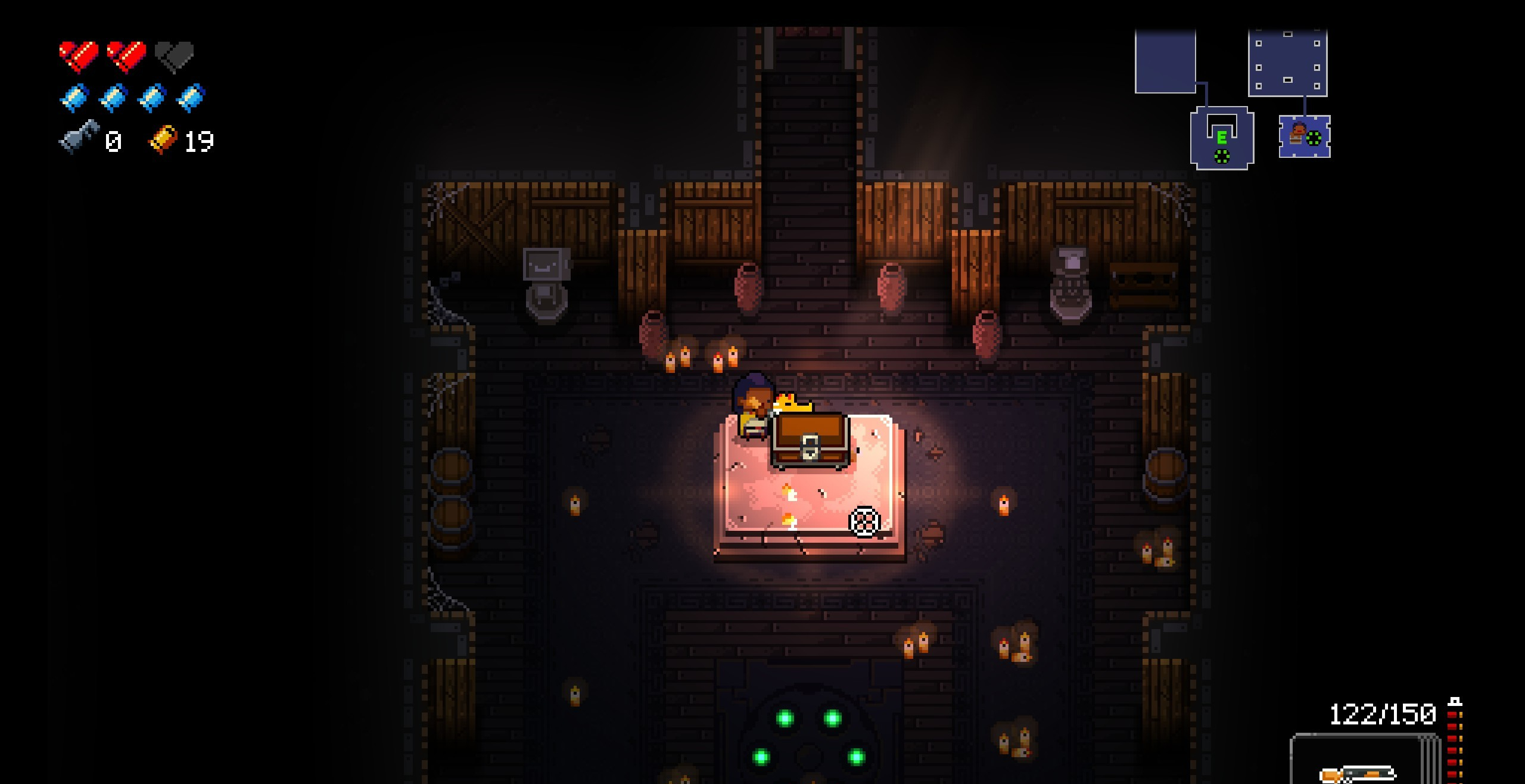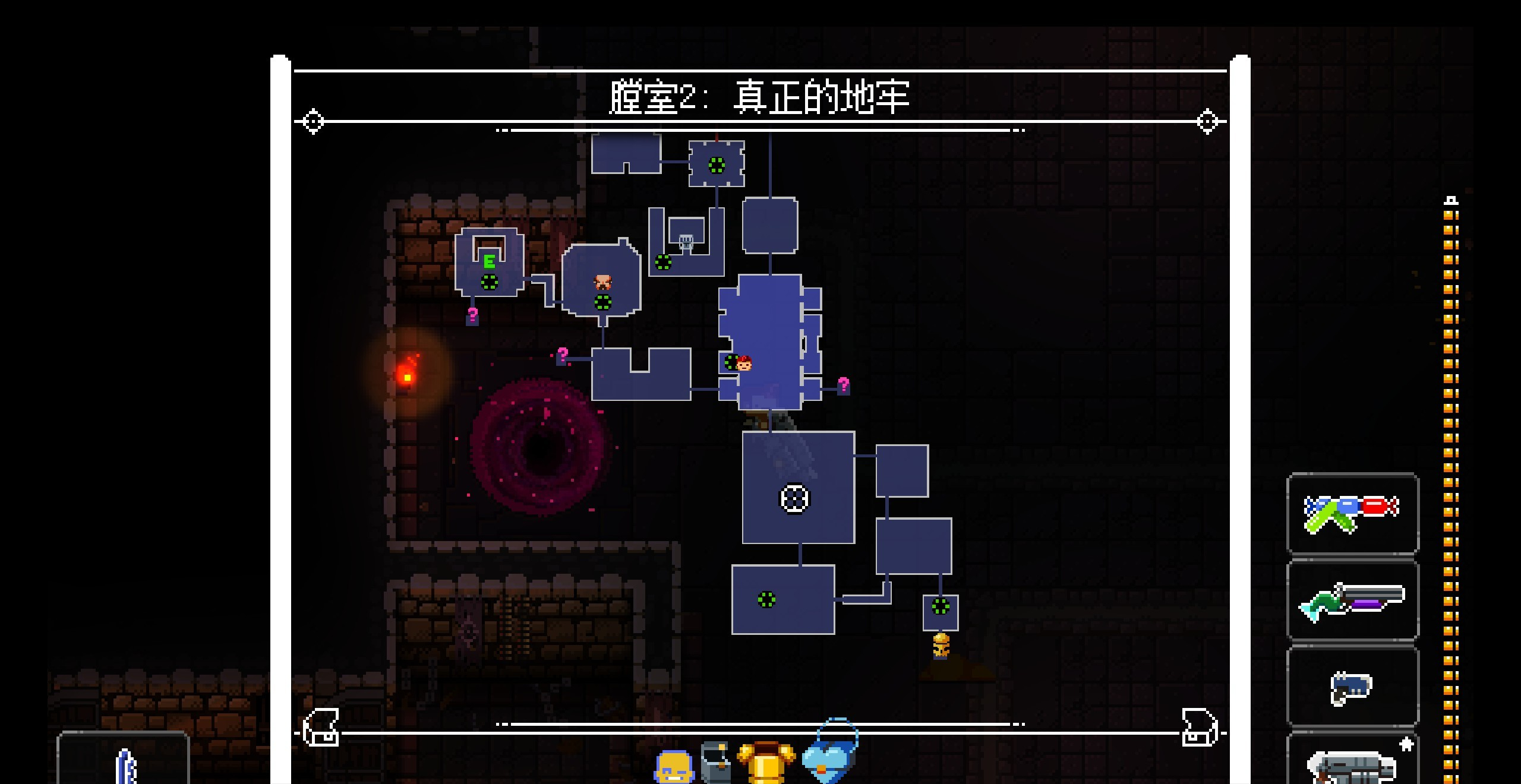 其次是重要道具在地圖上的顯示;玩家擊殺敵人可以隨機掉落一些重要道具,比如打開寶箱的鑰匙、血量道具、彈葯資源補充、子彈貨幣,不過小地圖中只會標明UI樣式,並沒有顯示在具體位置,找起來會有點不方便。嘛其實這也不算大問題,畢竟地牢還是需要探索的,不然可玩性就降低了,不過由於上述資源池的問題,導致難度曲線不平衡,很多玩家也不會沉住氣來遊玩,除非你是抖M╮(╯▽╰)╭所以只能盼之後還能調整一下資源池的問題與增加擊殺敵人掉落的子彈貨幣數吧,不然對於普通玩家而言體驗真的不太好。