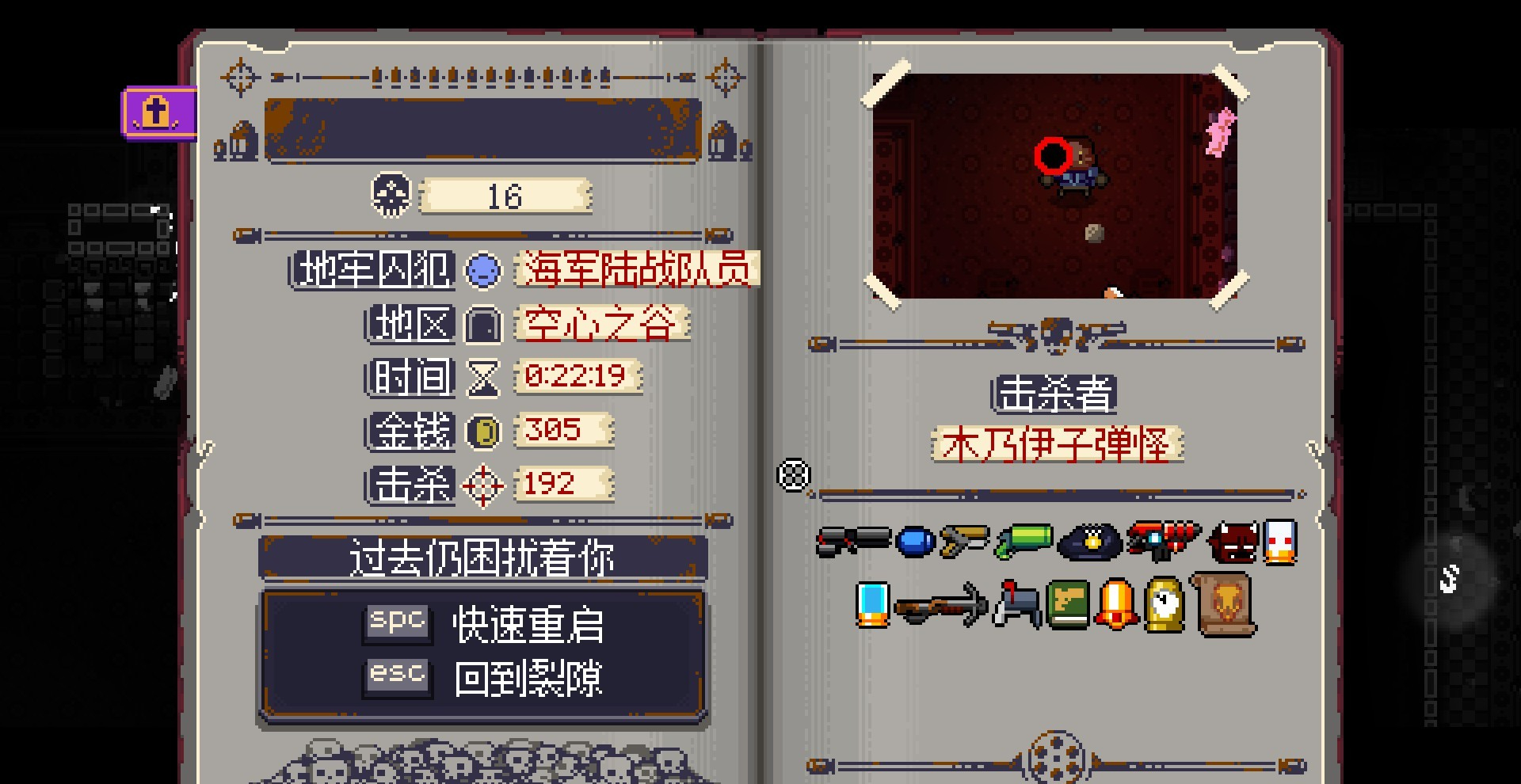 總結除去不太科學的難度曲線問題,本作質量還是十分高的,充分將肉鴿元素與彈幕射擊元素結合起來。以及雖是像素風格畫面但細節做得很不錯,大多數物品都能破壞,BGM也富有節奏,不過個人還是喜歡開著電音來遊玩~可惜的是不支持在線聯機,不然體驗應該會更好。