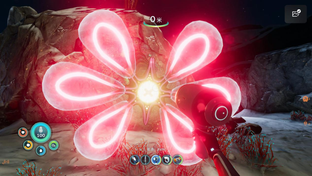 這可能聽起來好像和在水下活動時所需要維持的氧氣是差不多對等的概念,但在實際遊戲過程中,「溫度」這一生存屬性的存在感其實相當薄弱,先不提溫度下降的速度極為緩慢且恢復的手段遍地都是——在水中你甚至不會受到溫度的困擾,遊戲中也並沒有面積足夠大的地表區域供玩家進行長時間的深度探索。