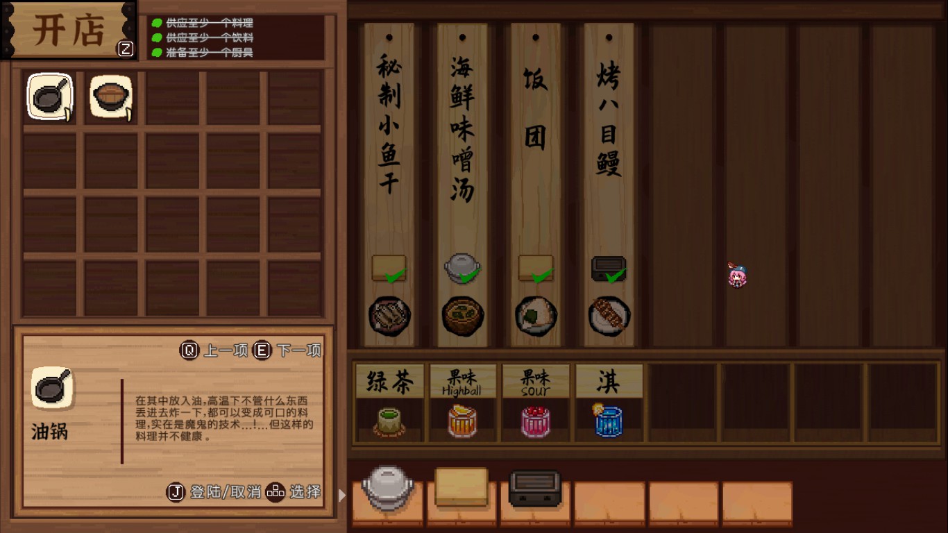 開始的時候沒找到丟棄的方法,非常占格子,後來發現保溫箱可以存放或者丟棄做錯和做壞的食物。但是如果夜雀之歌沒有出現失誤,則會有增益效果附加,甚至能掌握空中拋物這種高端又便利的上菜方式。除了擴大店面,後面還會解鎖新的地點,有新的NPC、野外食材以及更多的客人,讓幻想鄉的大家都嘗到美味的料理吧!