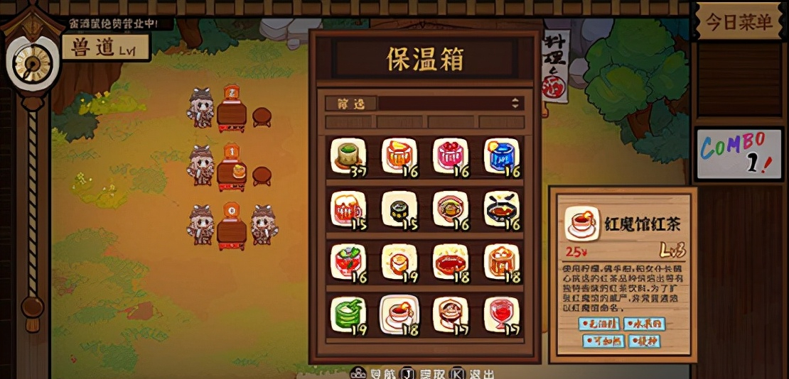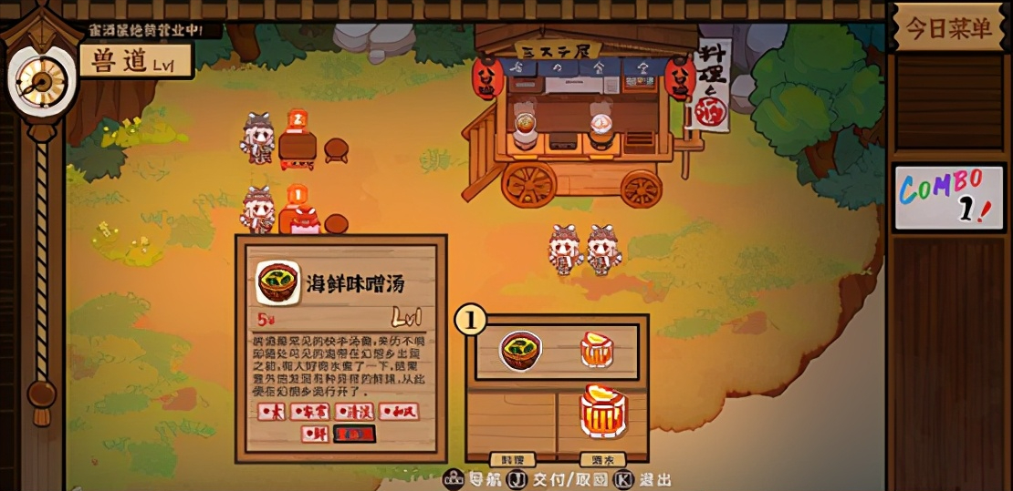 玩家等待客人的光臨並根據客人的需求來製作菜單上的食物,通過指定的鍋具來進行烹飪並配上茶水,然後端給客人,等待收錢。客人會有耐心設定,如果在長時間內還未給客人上菜,那麼客人可能會離開。(做飯類遊戲的基本模式)但由於目前遊戲處於ea階段,並且遊戲難度設定並不高,很少會出現耐心耗完的情況,並且遊戲前期貼心的給玩家准備了大量的酒水,讓玩家非常安穩的度過前期,讓玩家更好地熟悉遊戲內容。