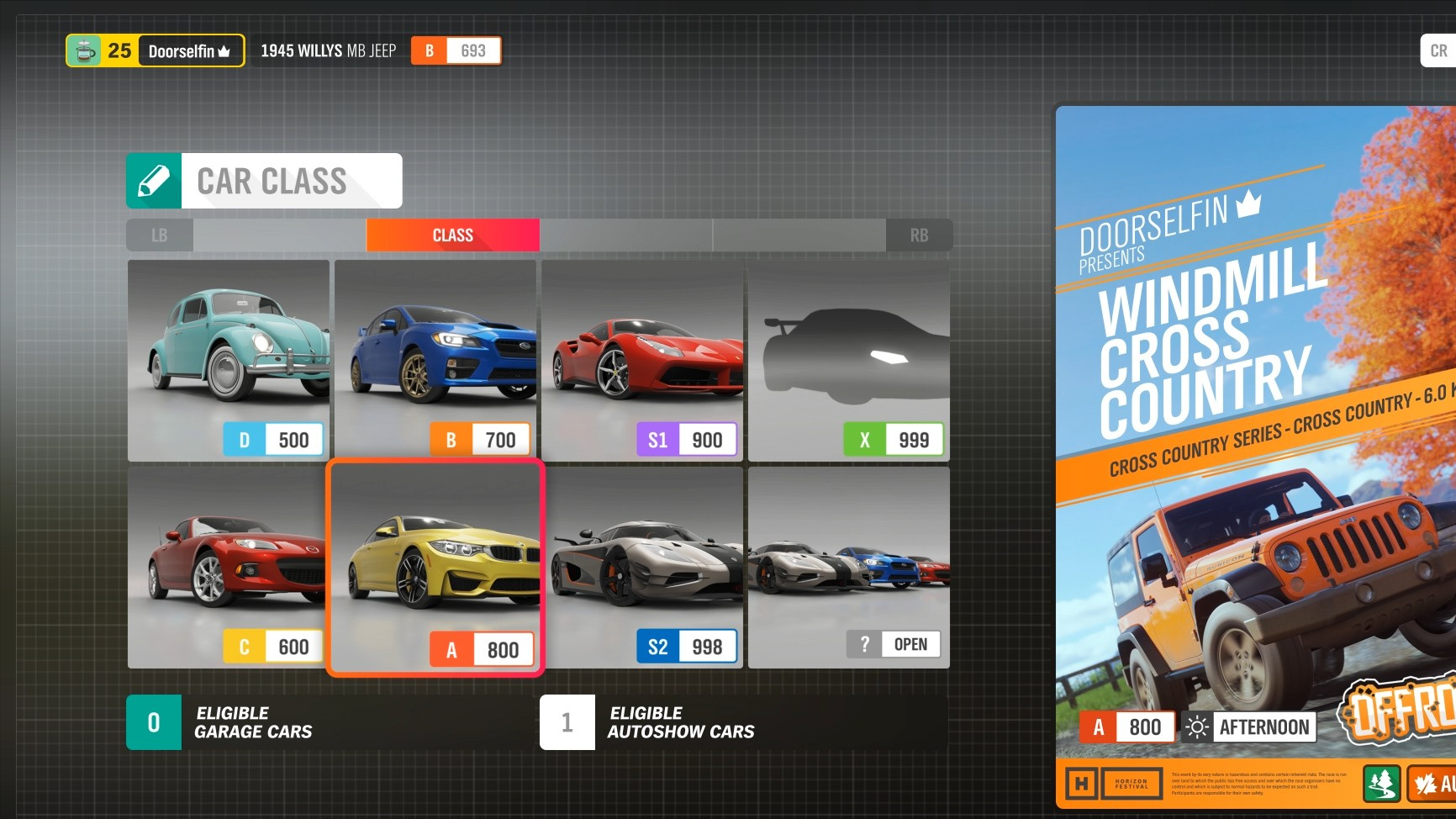 本作的基本模式延續了前作3代,絕大部分賽事不限定賽車品牌、類型、規格,而是利用龐大的賽車數量和賽事生成引擎技術,根據玩家正在駕駛的車輛,自動匹配同級別AI對手,玩家將不再有「買不起這個比賽所需車輛」的煩惱,即使少數指定車型的賽事,你也不需要購買該車輛,而是免費使用其參加比賽,總的來說,你在游戲中將不會受到任何車輛方面的限制,甚至可以一輛車搞定所有比賽,像筆者在游戲中基本就是兩輛車:單座跑車BAC Mono跑公路、光環疣豬號跑越野