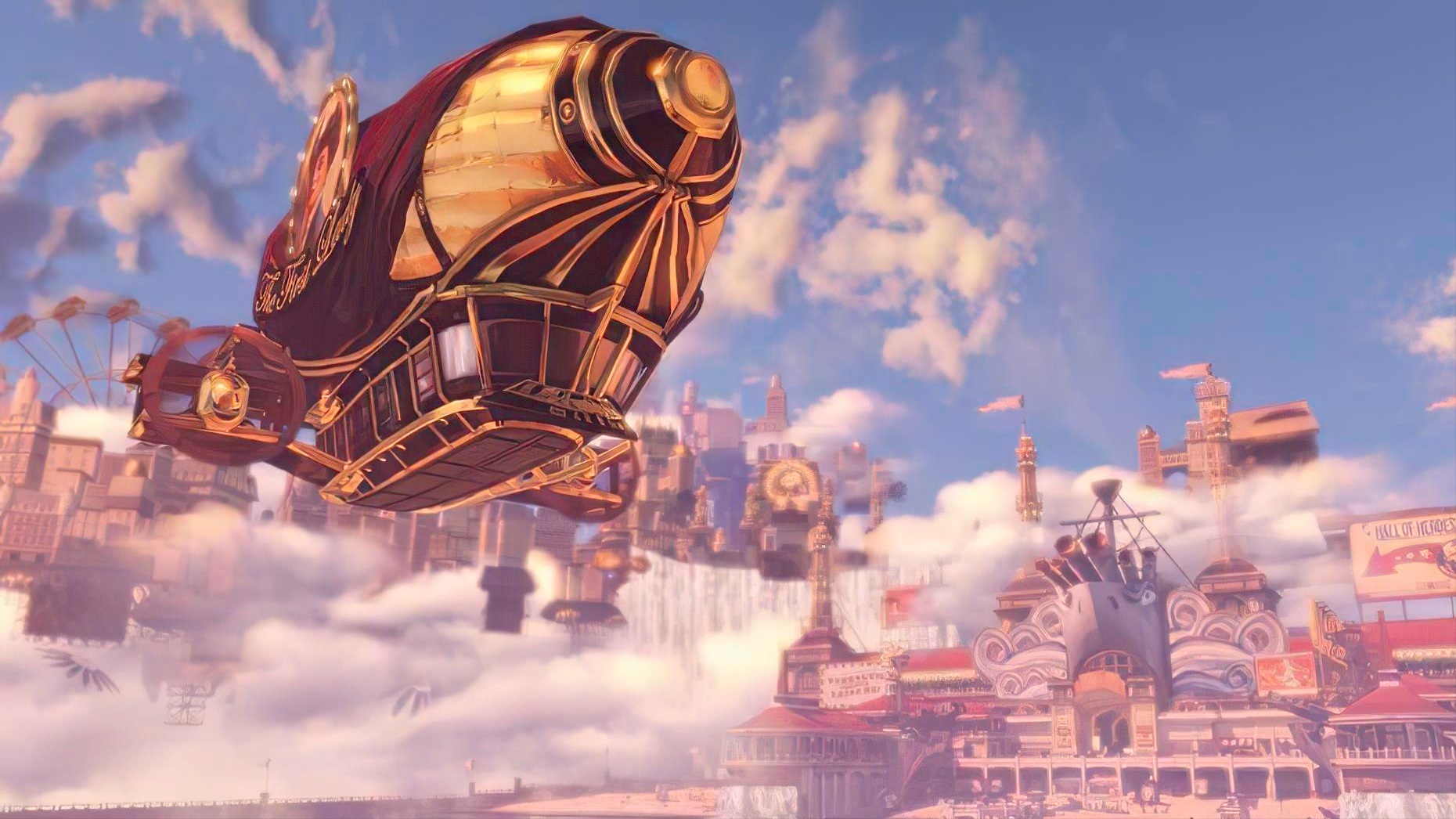 當我第一次到天空之城哥倫比亞的時候,那種畫面猶如愛人的嘴唇將我深深吸引,輕柔的BGM就像是媽**給孩子們哼唱的搖籃曲,一切都是那麼的美好,唯美的藍天白雲似乎只有在夢境才有可能出現,湛藍的天空就像一雙純凈的眼睛,她注視著我,我也面帶微笑懷著幸福望著她。還有那遠處漂浮著的建築,和行駛的巨大飛艇,都無不震撼著我的感官,就像名為幸福的被窩,我正安然酣睡。可以說這是我玩游戲以來畫面最美的游戲之一。要說的一點就是這是2013年的游戲,放在現在依然可以和目前的那些所謂的3A大作相媲美。