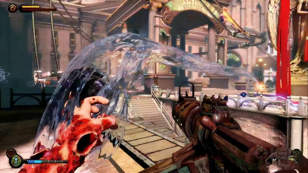 游戲在沒有戰鬥的時候無論是初到哥倫比亞的街頭,還是夜色之下的哥倫比亞都是那麼的美輪美奐,彷彿置身於童話世界之中。但是一旦開始戰鬥魔法與子彈齊飛,該血腥的地方血腥一點兒也不含糊。