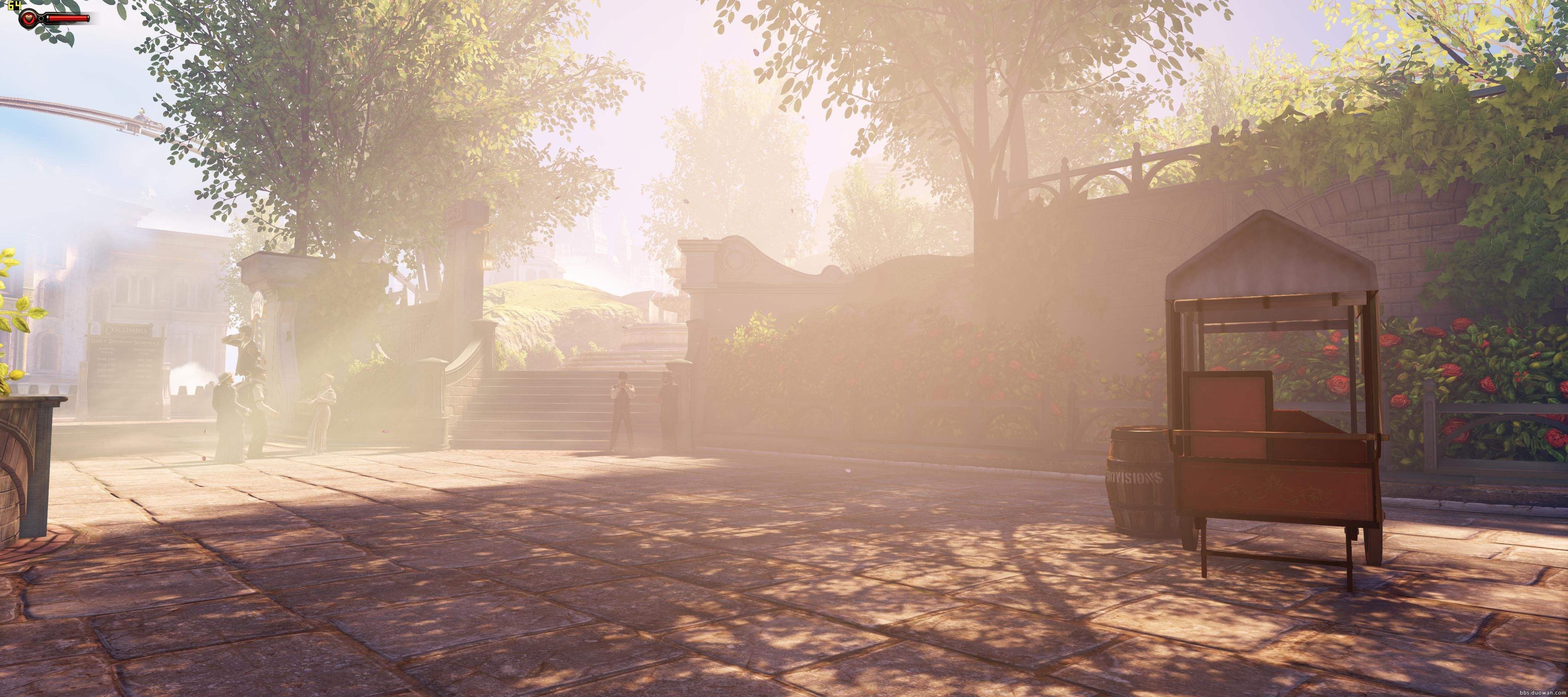 《生化奇兵無限》的畫面秉承著歐美游戲大廠商一貫的高水準製作水平,即使電腦配置很低(哪怕是我很久以前用的有GT840M小霸王筆記本)也能看到裡面精緻的模型和光影效果,非常流暢的體驗激烈的戰鬥場景。如果單從優化和對虛幻引擎的駕馭上來講,2K旗下的Irrational Games工作室比起現在用虛幻4做的熱門游戲《絕地求生》的藍洞工作室不知道要厲害多少倍。
