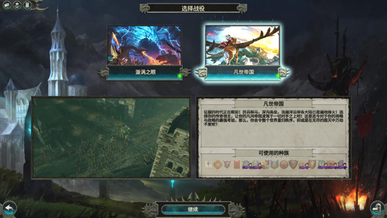 《全面戰爭:戰錘》系列的第一代是人類帝國、綠皮部落、吸血鬼伯爵和矮人以舊大陸為舞台進行爭霸,而第二代則是講述了高等精靈、黑暗精靈、蜥蜴人和斯卡文鼠人為奪下大漩渦(可以理解為新大陸)而奮戰的故事。而當玩家同時擁有這兩代時,則可在《全面戰爭:戰錘2》里遊玩名為「凡世帝國」的新劇本。凡世帝國劇本相當於一二兩代的融合,這不僅是地圖上的聯合,更是種族上的聯合,玩家可以在凡世帝國里玩到一二代里的所有種族,在目前所有dlc齊全的情況下,共有15個種族,65名領主可供選擇。
