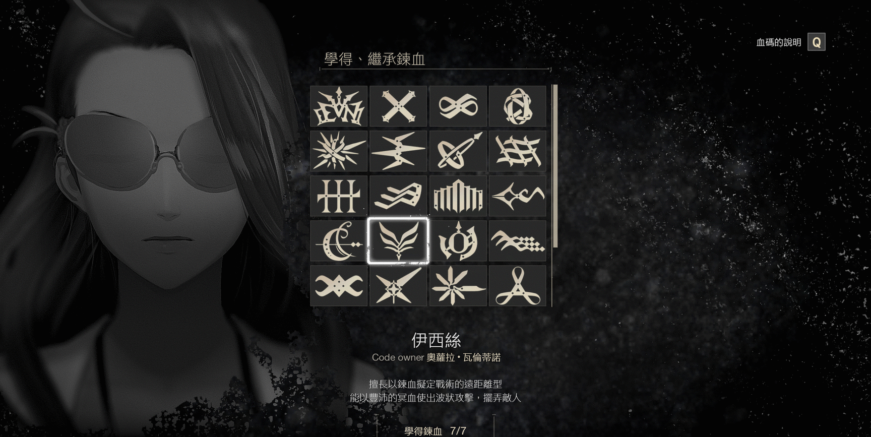 不同的牙裝攻擊形態會有所不同,而牙裝的不同又會影響彈反的操作,所以這里就需要玩家根據自己的操作習慣以及敵人來進行不同的裝備搭配。除此之外還會影響玩家裝備選擇的就是血碼,其實說白了就是玩家的職業,不同的血碼有不同的技能,技能的解鎖除了依靠遊戲中的主要貨幣外,還需要尋找名為血英碎片的材料來解鎖對應的技能。
