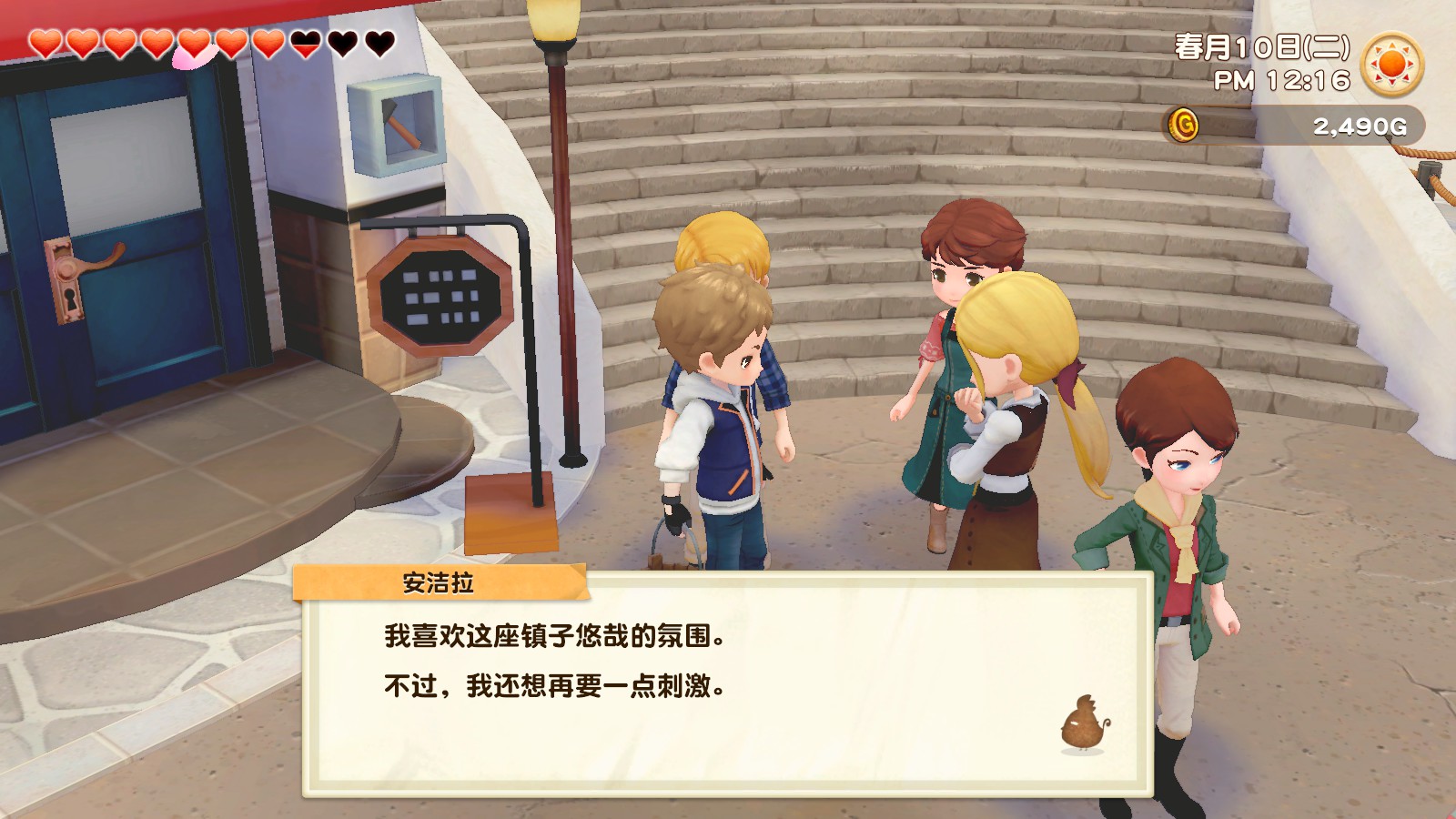 說到橄欖鎮,就不得不說,城鎮的玩法也是本作重要的組成部分,因此本作並非只有種田放牧。主角前往牧場旁的橄欖鎮,就可以去各個商店購買需要的物品,包括種子、工具、動物(家畜家禽和寵物都有),還可以找工匠為我們擴建住處,這樣我們就不用一直住在帳篷里了。在橄欖鎮,我們可以與NPC們交談,並且這種交談的行為是有獎勵的,後續的很多遊戲內容都是靠我們和NPC交談來解鎖。所以在橄欖鎮,玩家們肯定是人均「社交天花板」,看到NPC就上去攀談一番,這其實也是遊戲系統所鼓勵的,畢竟這樣才能讓玩家感受到生活在橄欖鎮的人情味嘛,而且在後面的遊戲中主角是要幫助鎮民們建設橄欖鎮的,所以橄欖鎮也是主角的家園,城鎮里的玩法佔了很多的內容。隨著劇情的推進,城鎮里還會有各種好玩的事件等待我們去參與,包括與鎮上的NPC交往乃至結婚,可以體驗的內容相當豐富。