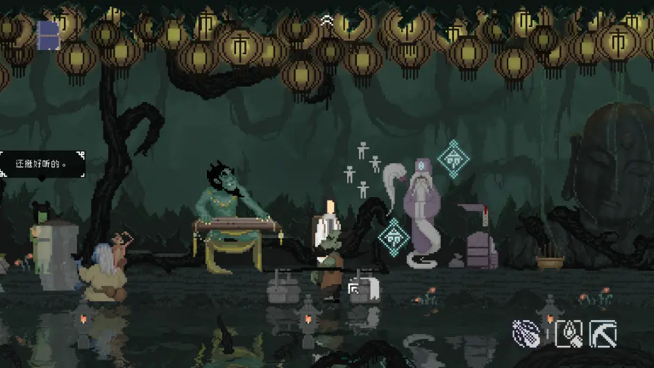遊戲進行到中期,我們從夢境中回歸之後,發現村子內布滿了蛛網,我們用紡車將蛛網紡織成琵琶琴弦時,我原本認為這個設定有點無厘頭。但當看到琵琶聲能驅散周圍的鬼火,甚至將後期的蜘蛛小妖嚇退後。
