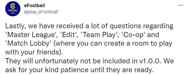 「大師聯賽」、「團隊遊戲」、「合作」、「比賽大廳」和「編輯」等模式都在1.0.0版本中缺失,科樂美在最新的推文中確定了這一點。它表示這些模式「很遺憾不會包含在1.0.0版本中」,玩家們需要耐心等待,直到他們准備好發布。