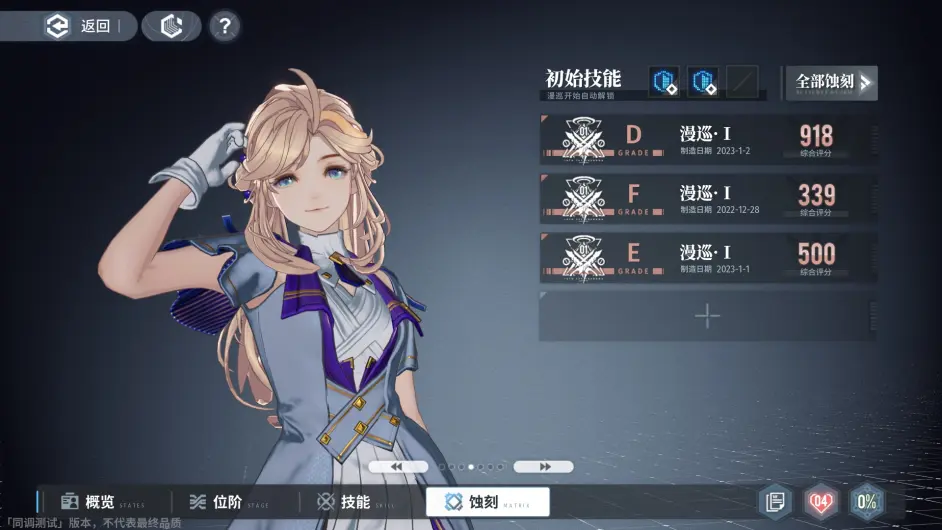 抽卡部分似乎還好,我們來看看養成。遊戲中的角色沒有常見的經驗等級,數值的提升主要來自以下幾個項目:位階、技能等級、體能特訓、異核等級、蝕刻。其中位階和技能等級目測都只有六段,而體能特訓是一個類似被動技能樹的系統,這三項都只需要消耗推關卡、刷圖所獲得的貨幣和材料,就能換取數值的提升。