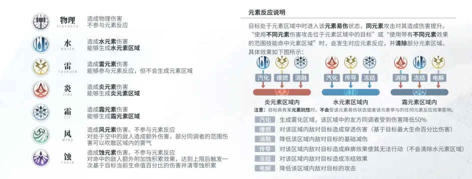 元素反應是本作比較重要的系統,角色的攻擊與技能除了物理傷害外,還有水、雷、炎、霜、風、蝕六大元素,其中水雷炎霜兩兩之間可以產生不同反應。比如角色發動技能後產生的一地積水屬於水元素區域,這時區域內的雷元素攻擊會與之反應產生「傳導」效果,麻痹區域內敵人使之暫時無法行動。這樣的特殊效果總共有 6 種,而風元素雖然不參與元素反應,但可以吹散 6 種特殊效果中「汽化」產生的霧氣。
