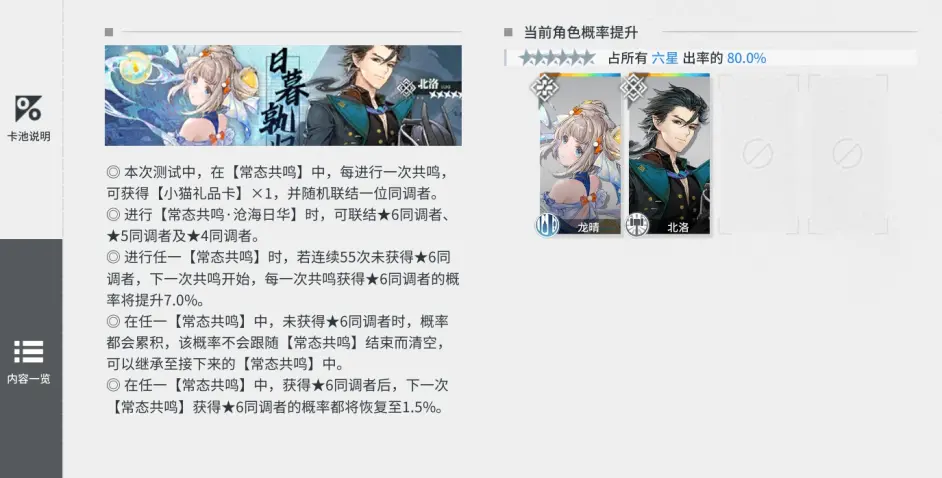 這次測試的卡池六星角色出現率是 1.5%,up 六星出率占所有六星出率的 80%,有保底機制,連續 55 次未獲得六星的話,下一次抽卡六星出率會提升 7%,也就是說,運氣最差的情況下,第 70 抽就能百分百出六星。當然,實際公測是否還是這樣的出率和保底也不一定。