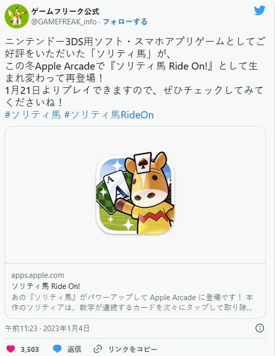 寶可夢開發商 Game Freak 宣布旗下紙牌遊戲《接龍賽馬》(ソリティ馬)系列新作《接龍賽馬Ride On!》將於 1 月 21 日登錄蘋果公司遊戲訂閱服務 Apple Arcade。